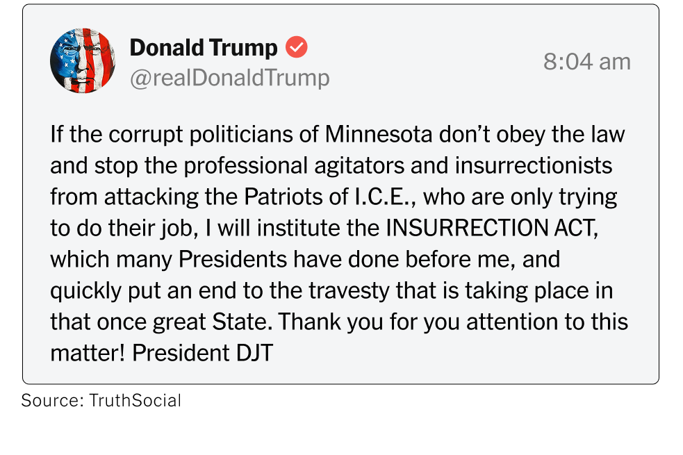 Trump’s post, while typical with his use of ALL CAPS and in need of a professional editor, accuses “the corrupt politicians of Minnesota” of being unable to “stop the professional agitators and insurrectionists” from interfering with I.C.E. who were just “trying to do their job.” This appears to be his raison d’etre for threatening to invoke the Insurrection Act (“Act”). In the near future, there will be a lot of talk and posts about the Act. So I thought it worthwhile to provide a quick guide to the Act.1